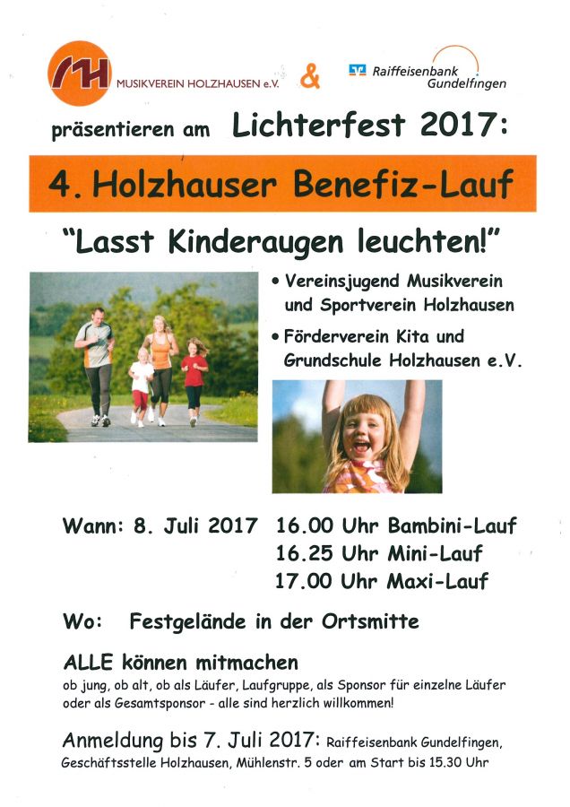 Auch dieses Jahr beginnt das Lichterfest mit einem Benefizlauf zu Gunsten der Kinder und Jugendlichen in Holzhausen. Das Motto lautet: "Lasst Kinderaugen leuchten"