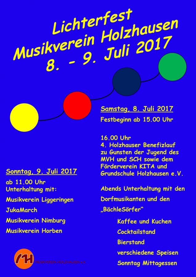 Wir laden Sie recht herzlich zu unserem diesjährigen und allseits beliebten Lichterfest in der Dorfmitte Holzhausen ein. Neben dem unten näher beschriebenen Benefizlauf kommen am Abend auch Tanzbegeisterte zu der Musik der BächleSörfer voll auf ihre Kosten. Wer den Abend lieber ruhiger und beschaulicher angehen möchte, dem stehen unsere Cocktail-Bar, der Wein- und Bierstand sowie ein reichhaltiges Essensangebot zur Verfügung.