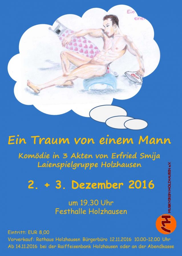 In diesem Jahr ist der Musikverein Veranstalter der Theateraufführung. Hierzu laden wir Sie recht herzlich ein. Die Laienspielgruppe Holzhausen hat wieder ein unterhaltsames und lustiges Stück einstudiert. Es lohnt sich also, am 2. oder 3. Dezember 2016 das Theater zu besuchen. Der Eintritt beträgt EUR 8,00. Der Kartenvorverkauf beginnt am 12. November 2016 von 10.00-12.00 Uhr im Bürgerbüro in Holzhausen. Danach erhalten Sie die Karten bei der Raiffeisenbank in Holzhausen, zu deren Öffnungszeiten.